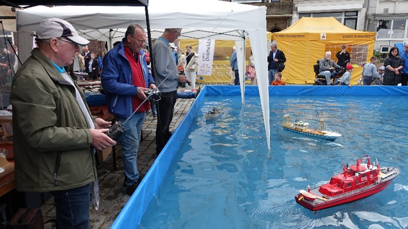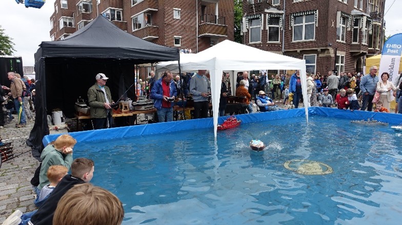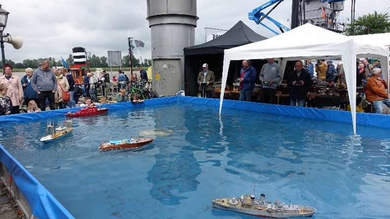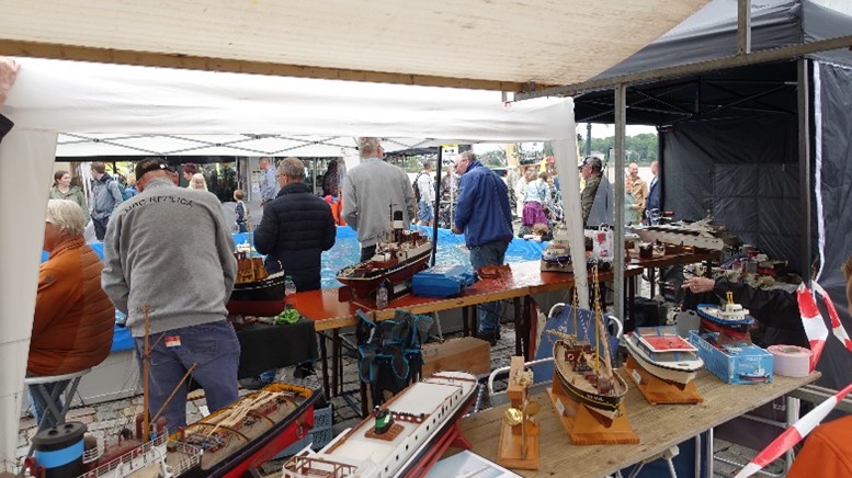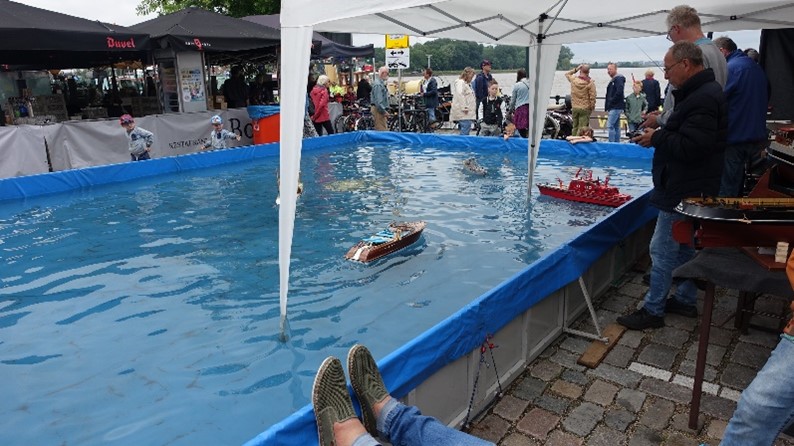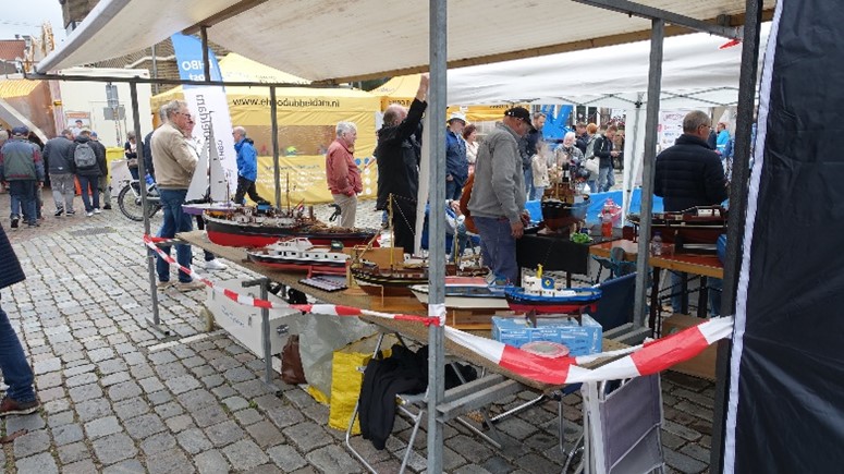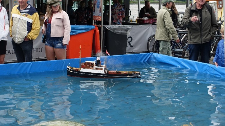 Zondag viel mee op het afbreken na. We hebben de haven nog in het bad gelegd. Dat was toch wat mooier, want aan de stand was niet veel te zien. Voordeel was wel dat de wachtrij voor Stoomboten langs onze “stand” ging, dus kregen we daardoor toch belangstelling genoeg. De ontscheepte bezoekers liepen langs de andere kant van het bad, waardoor toch ook van die kant belangstelling was, mits er gevaren kon worden.