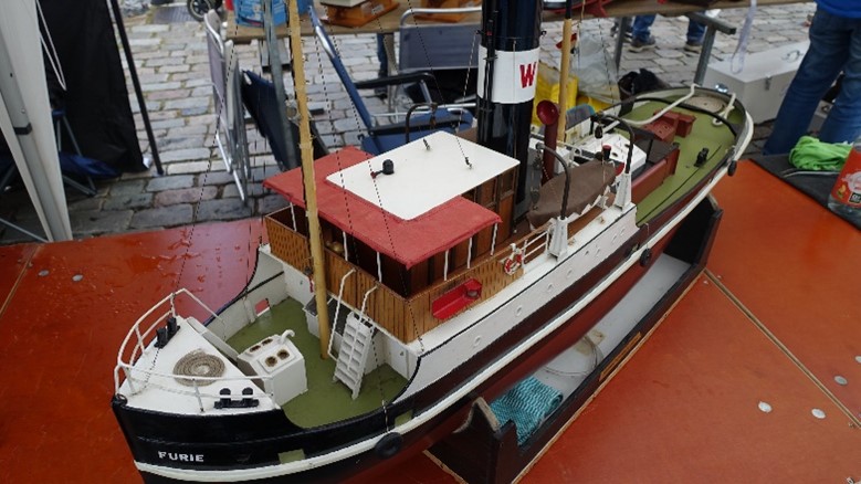 Die van Dick is het model uit de TV-serie ‘Hollands Glorie’ en die van Wim, die echt op stoom vaart ,een model van het schip zoals het nu in Maassluis ligt. Opvallend is het bakdek op de boeg van die van Dick.